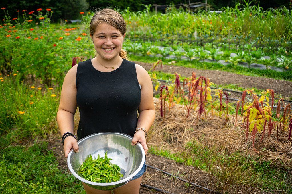 This agroecological approach to farming requires a lot of thought and analysis of the land and the role each area plays in the larger system. “We have a lot of deer pressure — they like to eat vegetables,” explains Kate Anstreicher, program coordinator. “We had to build a deer fence this season, so we considered the whole area during the planning process. We built a fence with twelve-foot cedar posts. Cedar is a very hardy wood that is resistant to decay. But the wood is also attractive to birds. We get a lot of American Kestrels and the posts are an advantageous place for them to perch and hunt. That helps keep the rodent population in check. Every decision has the greater ecosystem in mind.”
