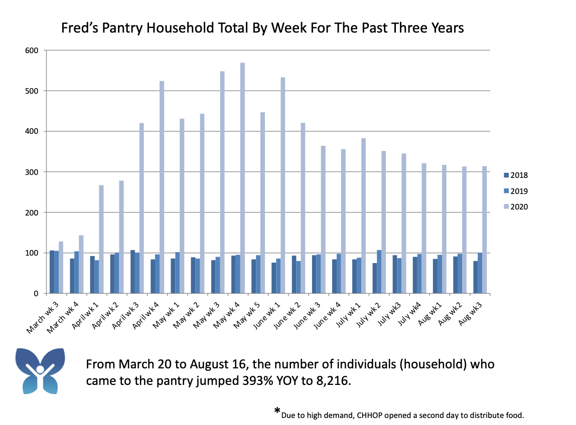 Demand for food at Fred’s Pantry remains high. The number of individuals (household) who came to the pantry jumped 393 percent year-on-year to 8,216. The number of household family members who were provided with food by Fred’s Pantry rose 427 percent year-on-year to 32,816. For those experiencing financial instability, unexpected job loss or food insecurity, access to free, healthy and nutritious food allows people to use their money for other necessities such as rent and bills.